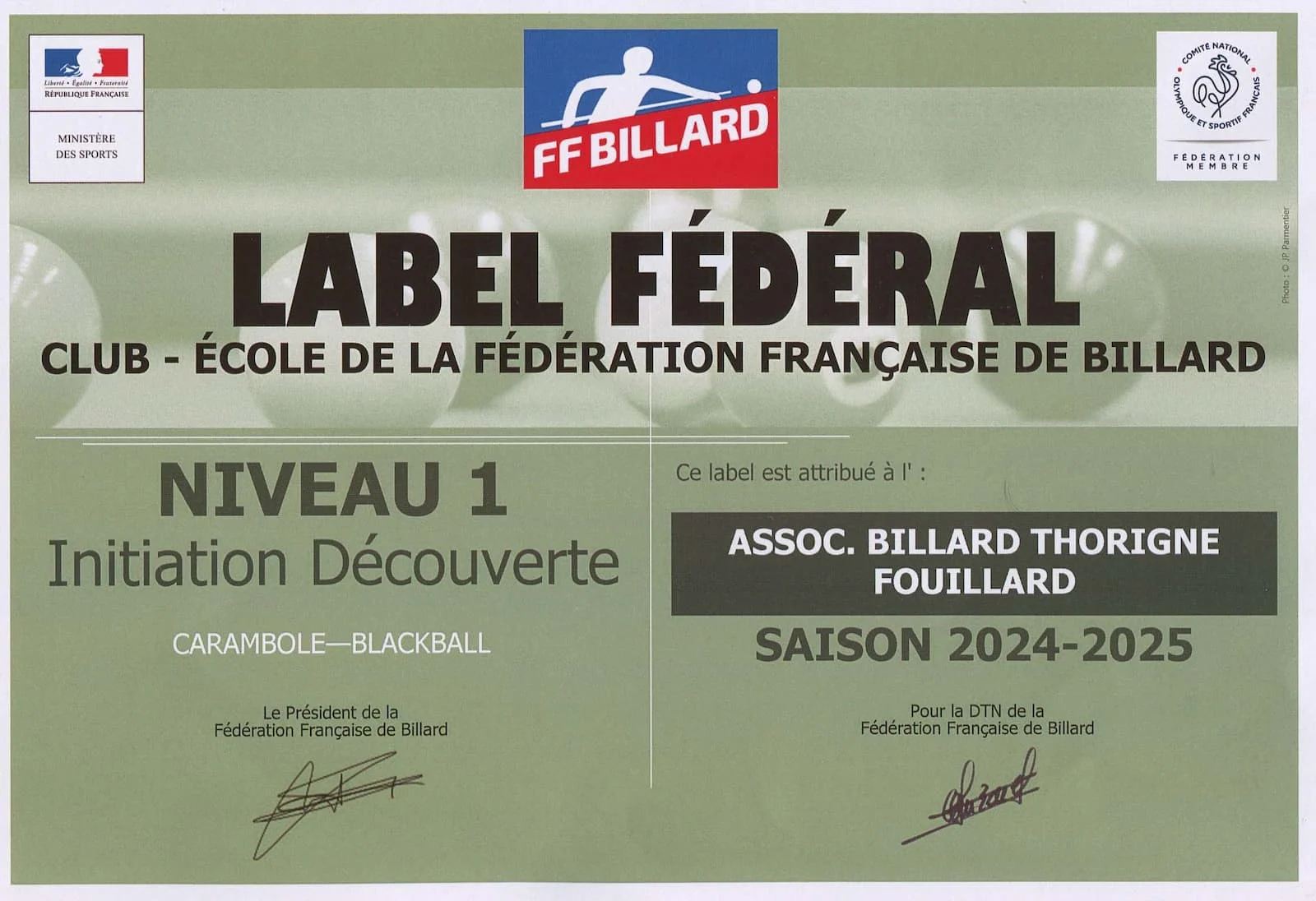 Grâce à ses bénévoles formateurs certifiés qui dispensent gracieusement des formations en interne, l’ABTF obtient pour la deuxième année consécutive le label fédéral « club école » dans deux disciplines : la carambole (billard français) et le blackball (billard anglais).