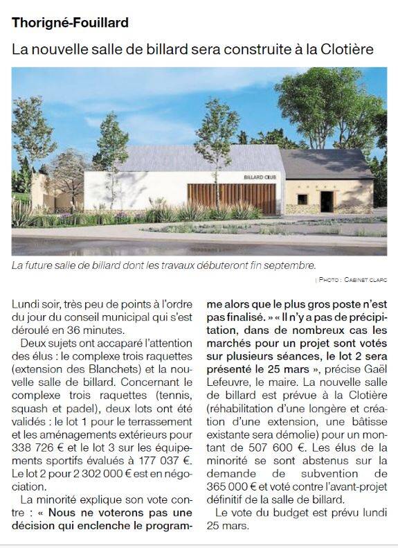 Dans les cartons depuis quelques mois, le projet de nouvelle salle de billard vient de se concrétiser avec le vote favorable du conseil municipal sur l’avant projet définitif.